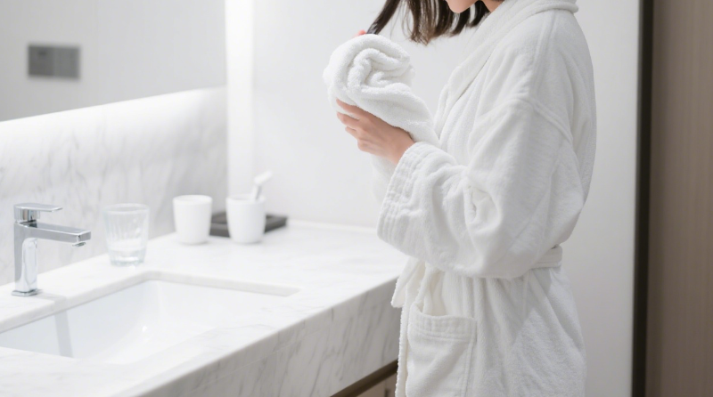 Malalaman muna natin ang istraktura ng mga tuwalya. Karaniwang ginagawa ang mga tuwalya sa pamamagitan ng paghabi ng matibay na baseng tela sa isang pattern ng warp at weft, na ang ibabaw ng base na tela ay nagtatampok ng mga loop na hugis singsing. Ang mga tuwalya ay karaniwang hinabi mula sa isang matibay na base na tela sa warp at weft. Ang ibabaw ng base na tela ay may mga loop na hugis singsing. Ang istrukturang ito ay nagreresulta sa ang tuktok ng mga loop ay pinatuyo nang pinakamabilis sa panahon ng proseso ng pagpapatuyo ng tuwalya, dahil sila ay direktang nakalantad sa pinainit na hangin. Kapag ang tuktok ng mga loop ay tuyo, mayroon pa ring nalalabi sa tubig sa mga base na tela ng mga tuwalya. Kapag ang base na tela ay ganap na tuyo, ang tuktok ng mga loop ay magiging labis na tuyo, upang maging matigas ang kamay ng mga tuwalya.
