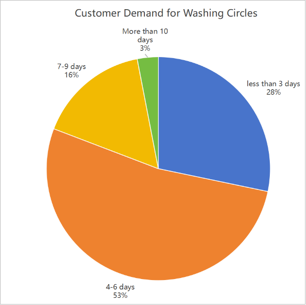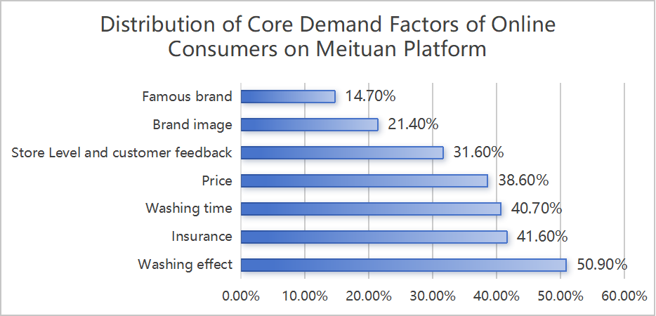 Ang isa pang dimensyon na binibigyang pansin ng mga customer ay ang oras ng paghuhugas. Ayon sa survey ng customer ng Meituan, sa proseso ng pagsunod, binibigyang pansin ng mga customer ang oras ng paghuhugas. Gusto ng 28 porsiyento ng mga customer ang serbisyo sa paglalaba magtatapos sa 3 araw. Mahigit sa kalahati ng mga customer (52%) ang gustong matapos ang serbisyo sa paglalaba sa loob ng 4-6 na araw. Wala pang 20 porsiyento lamang ang maaaring tumanggap ng 7-araw na bilog na paghuhugas.