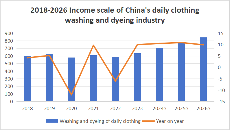 Bilang pangunahing bahagi ng serbisyo upang matugunan ang mga pangangailangan ng pang-araw-araw na buhay ng mga tao, ang industriya ng paglalaba at pagtitina ay patuloy na lumalago mula noong katapusan ng epidemya, at ang laki ng merkado ay patuloy na lumalawak. Noong 2023, ang taunang kita sa pagpapatakbo ng China paglalaba at industriya ng pagtitina ay umabot sa 129.06 bilyong yuan. Kabilang sa mga ito, ang pang-araw-araw na mga serbisyo sa paglalaba at pagtitina ng damit ay umabot sa 49.4% ng taunang kita ng industriya, na umaabot sa 63.76 bilyong yuan, na nakabawi sa parehong panahon noong 2019. Ayon sa mga pagtatantya, pagsapit ng 2026, ang taunang kita ng araw-araw Ang sektor ng paglalaba at pagtitina ng damit ay lalampas sa 80 bilyong yuan, na may compound growth rate na halos 10%.